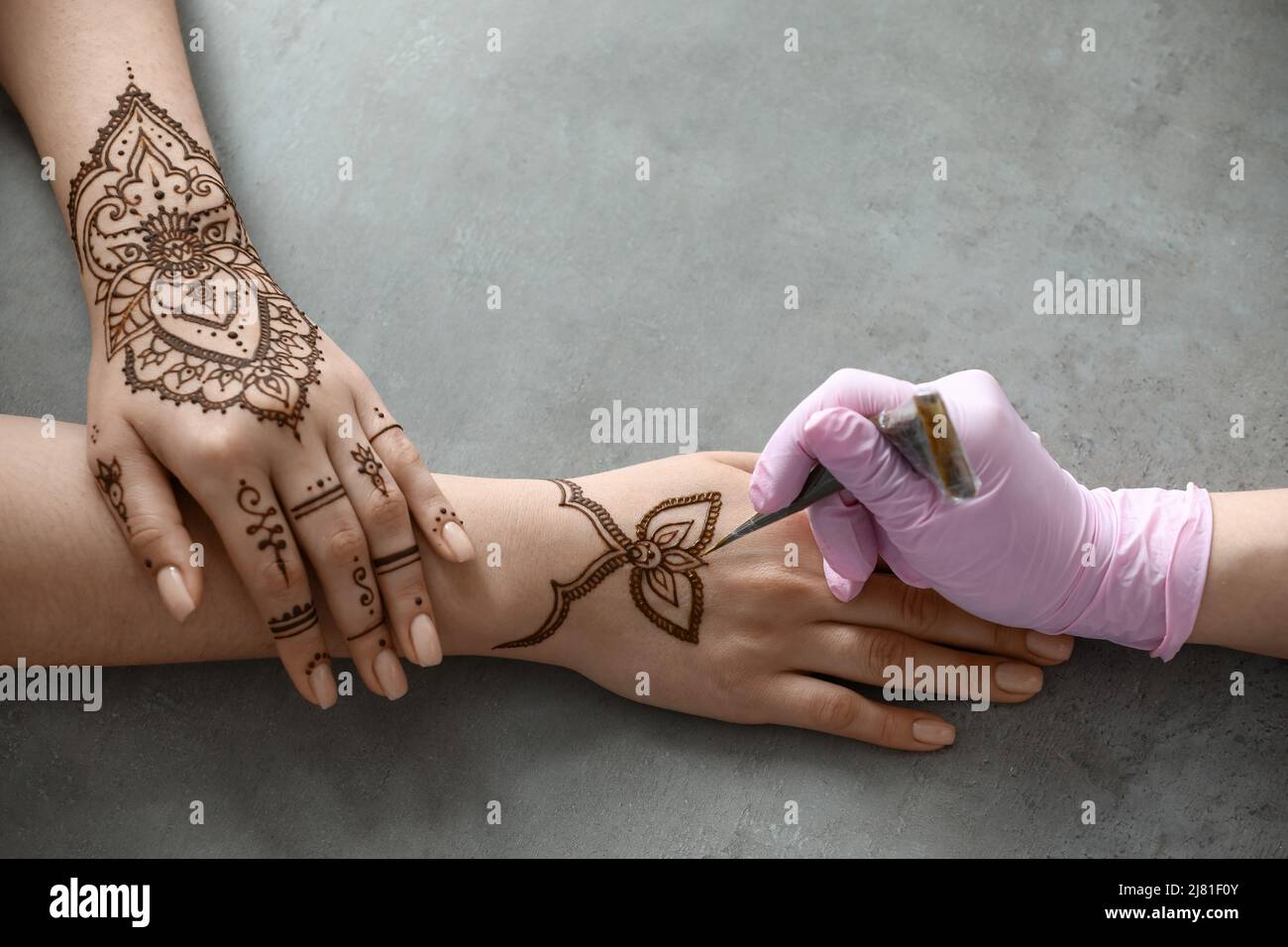 Mehndi Master Drawing Henna Tattoo On Female Hand In Salon Stock Photo Alamy